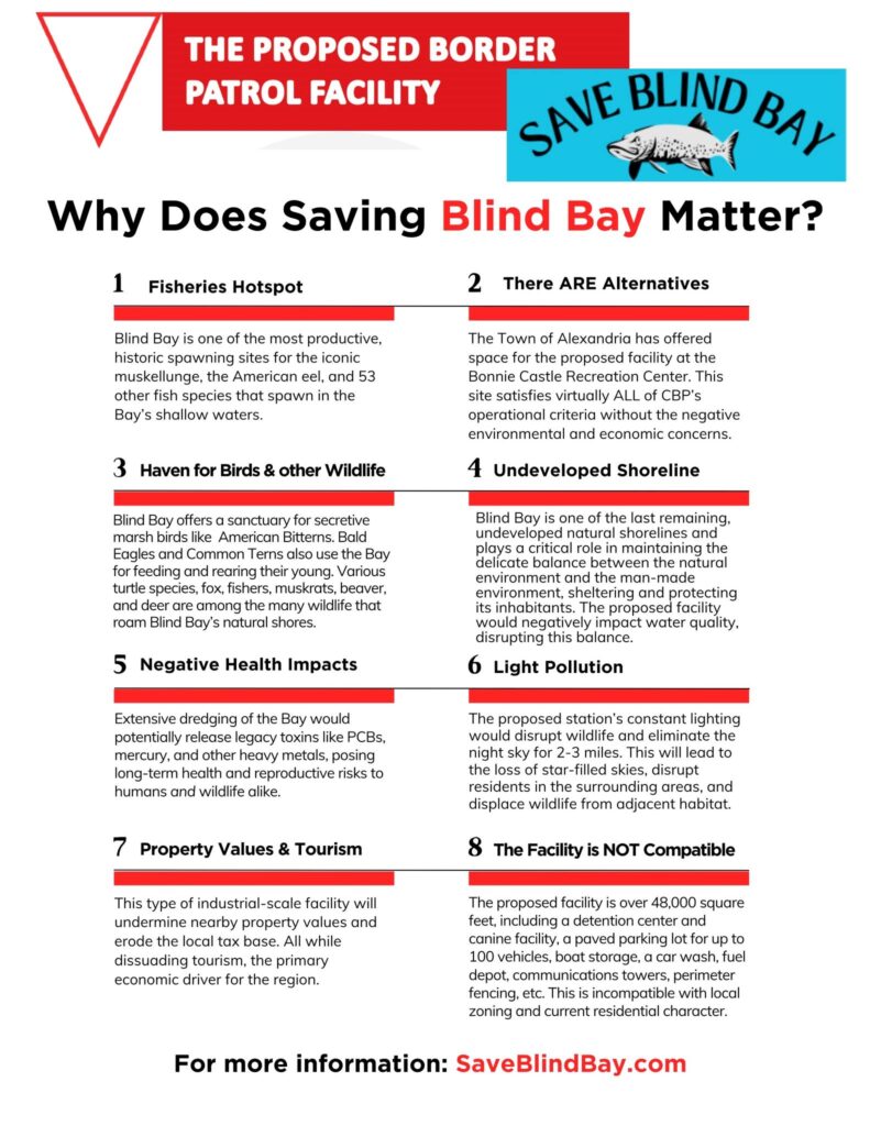 The facility will be directly in the line of sight of Thousand Islands Park and will be lit 365 nights per year. The Blind Bay site is zoned Rural Residential. Thousand Islands Park relies on the town’s zoning to protect it from inappropriate development. And the plan conflicts with the Town of Orleans recently completed Comprehensive Plan and Local Waterfront Revitalization Plan.